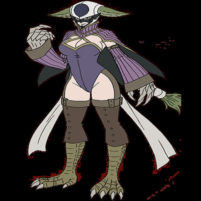 This is an image of Kyoka, a fictional character from the Fairy Tail manga and anime series created by Hiro Mashima. Kyoka has a very distinct appearance, especially due to her half-human/half-bird characteristics. Kyoka's head is decorated with an elaborate helmet, which covers most of her face to save her eyes and mouth.